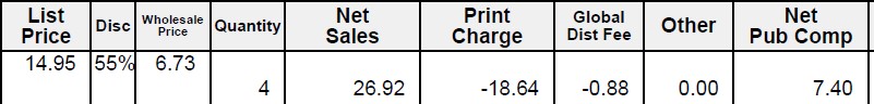 Below is an example of my IngramSpark net compensation on 4 paperbacks with a 55% discount. The wholesale price from a 14.95 list price is $6.73. Then the printing costs and global distribution fees are deducted. It comes to $1.85 per book: